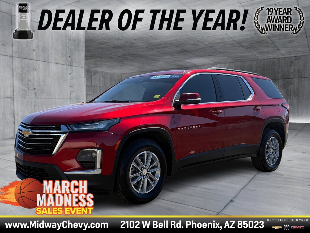 Discover the 2022 Chevrolet Traverse LT Cloth: A Cherry Red Tintcoat SUV Designed for Adventurers Seeking Comfort, Safety, and Versatility in Every Journey.Step into the world of the 2022 Chevrolet Traverse LT Cloth, where style meets functionality in a stunning Cherry Red Tintcoat. This SUV is perfect for those who crave adventure without compromising on comfort and safety. Equipped with a robust V6 engine and a smooth 9-speed automatic transmission, the Traverse delivers a powerful yet efficient driving experience. Designed with family in mind, it offers a spacious interior with a third-row seat, ensuring ample room for everyone and everything.Safety is a top priority with features like Blind Spot Monitor, Front Collision Mitigation, and Lane Keeping Assist, providing peace of mind on every drive. The integrated technology, including a Back-Up Camera and Bluetooth Connection, keeps you connected and confident on the road. The Traverse's sleek design is complemented by aluminum wheels and heated mirrors, offering both style and practicality.Whether you're navigating city streets or exploring new terrains, the 2022 Chevrolet Traverse LT Cloth is your reliable companion, combining advanced safety features and versatile seating to accommodate all your adventures. Embrace the journey with a vehicle that truly understands your needs.Be sure to call or visit Midway Chevy to discover more. Your new favorite vehicle awaits - don't let someone else drive it home!?