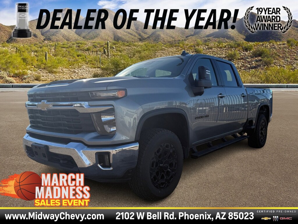 AWD / 4WD / 4X4, BEST PRICE, BEST SELECTION, EASY TO DO BUSINESS WITH, At Midway Chevy we keep the best & wholesale the rest, Just arrived and pending inspection., Silverado 2500HD LT, 4D Crew Cab, Duramax 6.6L V8 Turbodiesel, Automatic, 4WD, Sterling Gray Metallic, Black Leather, 10-Way Power Driver Seat Adjuster w/Lumbar, 120-Volt Bed Mounted Power Outlet, 120-Volt Interior Power Outlet, 170 Amp Alternator, 2-Speed Electronic Shift Transfer Case, 4-Way Manual Driver Seat Adjuster, Bed View Camera w/2 Trailer Camera Provisions, Black Chevytec Spray-On Bedliner, Black Mirror Caps, Black Name Plates (LPO), Black Tailgate Lettering (LPO), Bluetooth® For Phone, Chevrolet Connected Access Capable, Cloth Rear Seat w/Storage Package, Color-Keyed Carpeting Floor Covering, Compass, Convenience Package, Convenience Package II, Dark Essentials Package (LPO), Deep-Tinted Glass, Dual-Zone Automatic Climate Control, Electric Rear-Window Defogger, Electronic Cruise Control w/Set & Resume Speed, EZ Lift Power Lock & Release Tailgate, Front Black Bowtie Emblem (LPO), Front LED Fog Lamps, Front Rubberized Vinyl Floor Mats, Gooseneck/5th Wheel Package (DISC), Gooseneck/5th Wheel Prep Package, Halogen Reflector Headlamps, HD Rear Vision Camera, HD Surround Vision, Heat Package, Heated Driver & Front Outboard Passenger Seating, Heated Steering Wheel, Heated Vertical Trailering Mirrors, Hitch Guidance w/Hitch View, In-Vehicle Trailering App System, Keyless Open & Start, Leather Package, LED Cargo Area Lighting, Manual Tilt & Telescoping Steering Column, Manual Tilt-Wheel Steering Column, OnStar & Chevrolet Connected Services Capable, Power Door Locks, Power Front Windows w/Driver Express Up/Down, Power Front Windows w/Passenger Express Down, Power Rear Windows w/Express Down, Power Sliding Rear Window w/Defogger, Preferred Equipment Group 1LT, Push Button Start, Rear 60/40 Folding Bench Seat (Folds Up), Rear Cross Traffic Alert, Rear Park Assist, Rear Rubberized Vinyl Floor Mats, Remote Start Package, Remote Vehicle Starter System, Safety Package, SiriusXM w/360L, Standard Tailgate, Steering Wheel Audio Controls, Suspension Package, Trailer Camera Provisions, Trailer Side Blind Zone Alert, Unauthorized Entry Theft-Deterrent System, Universal Home Remote, Up-Level Rear Seat w/Storage Package, Wi-Fi Hotspot Capable, Wireless Phone Projection, Wrapped Steering Wheel. Clean CARFAX. LT 4D Crew Cab Duramax 6.6L V8 Turbodiesel 4WD AutomaticRecent Arrival!